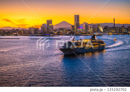 日本の横浜都市景観珍景富士山と飛鳥Ⅲが競演(大さん橋へ)(新港ふ頭ににっぽん丸・日本の豪華客船2隻)