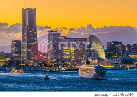 日本の横浜都市景観新景3隻コラボ。師走の満月。大さん橋の飛鳥Ⅱやパシフィック・ワ号、オーシャンフジ…