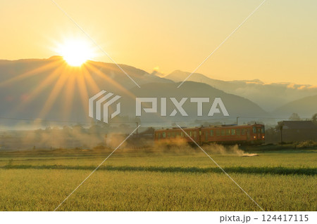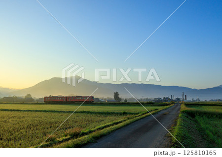 越前田野の家並みと蕎麦畑が越美北線の始発列車を迎えた