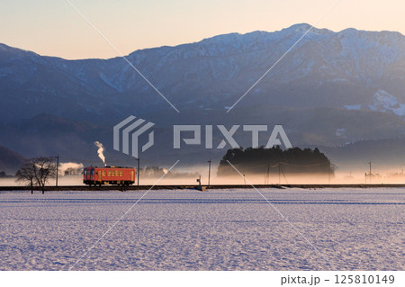 雪で固まった狭間踏切付近の田んぼの中を走る越美北線の単行気動車