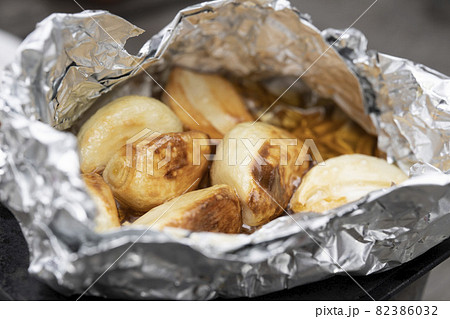 山でアウトドア調理する蒸したての豚まんといなり寿司