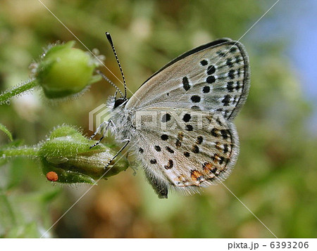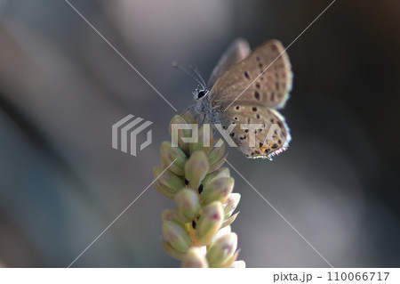 ツメレンゲの花穂で休息中のクロツバメシジミ