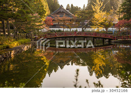 和歌山 紅葉の高野山 不動堂前の池にかかる赤い橋