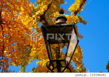黄色いイチョウとガス灯