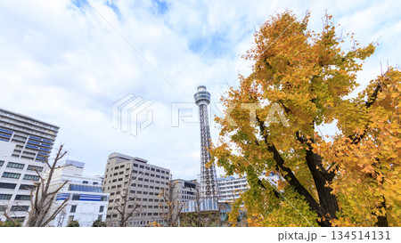 マリンタワーと紅葉したイチョウの木