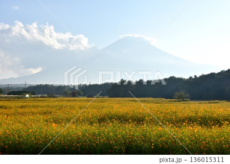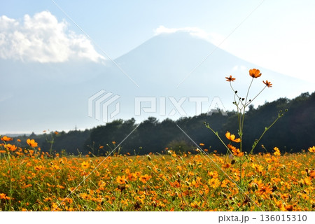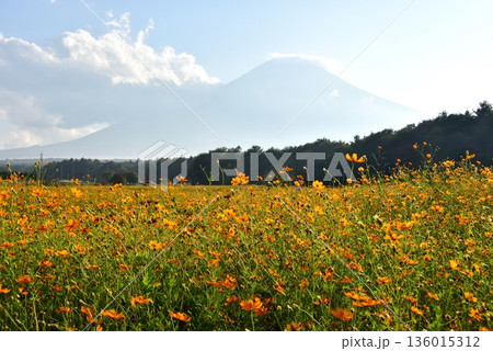 山梨県 山中湖花の都公園 黄花コスモス畑と富士山
