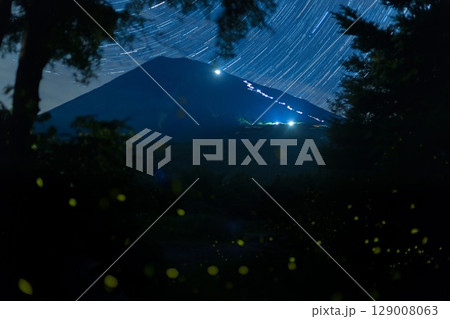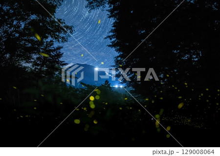富士宮の公園から富士登山の光と星の周回運動の軌跡とヒメボタルの光