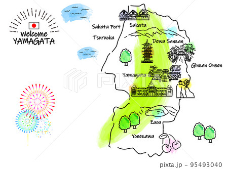 山形県の観光地のシンプル線画イラストマップ
