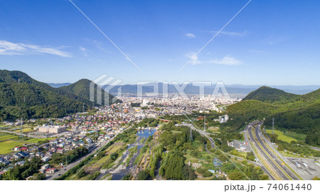 姨捨サービスエリアの空撮、長野自動車道と山々の絶景
