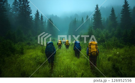 Group of hikers ventures through verdant forest toward misty mountain vista