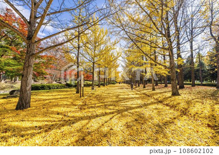 秋の山形県総合運動公園のいちょう並木 イチョウの葉 山形県天童市