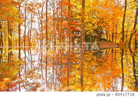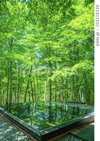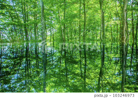 ステンレスの鏡に映る緑の葉が生い茂るブナの木々