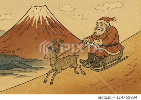 赤富士の斜面をソリで滑るサンタクロースとトナカイの浮世絵風イラスト