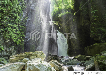 新緑のスッカン沢から光芒の差し込む雄飛の滝