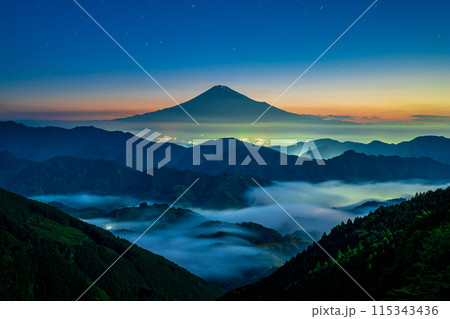 初夏の清水吉原から見た黎明の富士山と雲海