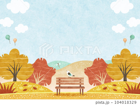 秋の紅葉と公園のベンチにとまる小鳥 自然の水彩背景イラスト
