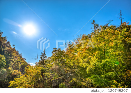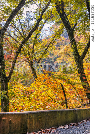 秋の山梨県甲府市の昇仙峡の遊歩道にある東屋付近の紅葉