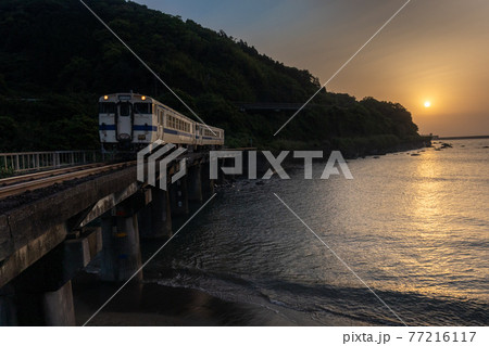 朝焼けの宮崎県日南市山王浜の波打ち際の隈谷川橋梁を走る日南線キハ40