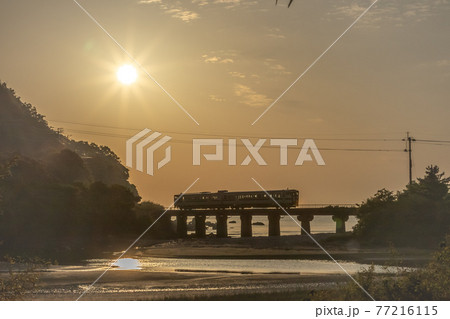 朝日の陽を背に海岸線の鉄橋を渡る列車