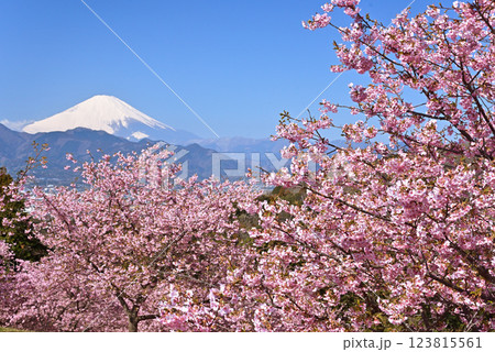 早春の神奈川県松田町 松田山の河津桜と富士山