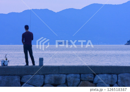 釣人の前方を ゆっくり進む豪華客船