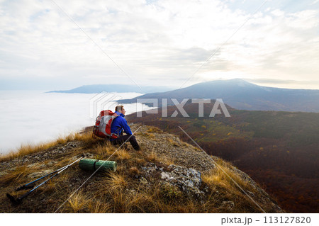 Young tourist hiker with backpack siting and relaxing on the top of the mountain and looking at beautiful yellow autumn landscape sunset over clouds