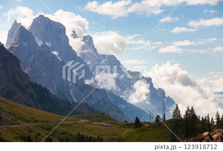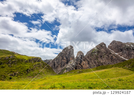 Rocky mountain peaks of Italian Dolomites on sunny summer day