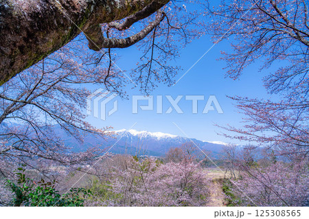 【桜素材】大草城址公園から見る桜と残雪の中央アルプス【長野県】