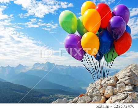 Bright colorful balloons tied together on a rocky mountaintop with a scenic view of mountains