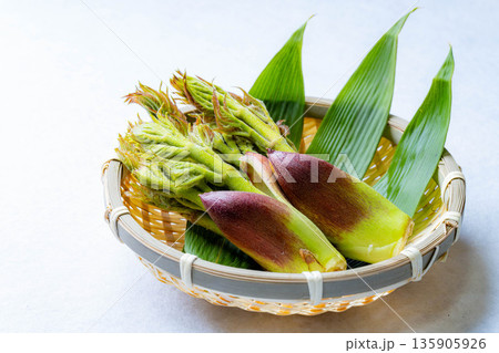 白バックで扇形のざるに並べたタラの芽