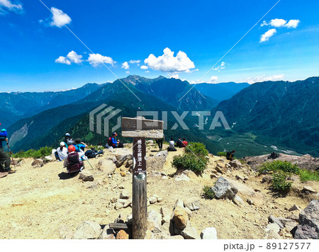 長野県の北アルプスの常念岳山頂から槍穂高連峰を展望する