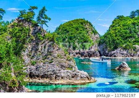 夏の浦富海岸をめぐる遊覧船