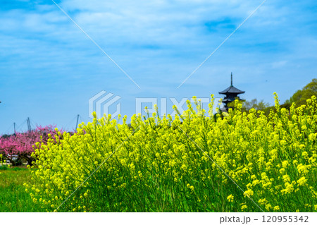 備中国分寺の春 菜の花と桃と五重塔3 岡山県総社市
