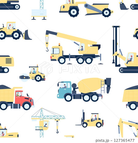 Special vehicle seamless pattern. Construction trucks and crane, concrete mixer and asphalt paver. Childish elements print, vector background
