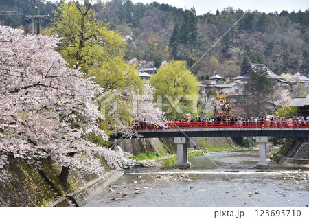 日本の岐阜県高山市 春の高山祭 満開の桜と中橋を渡る屋台 美しい新緑と宮川