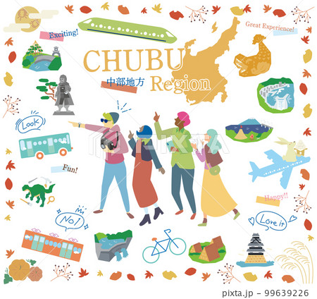日本の中部地方の秋の名物観光を楽しむ観光客、アイコンのセット(フラット)