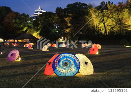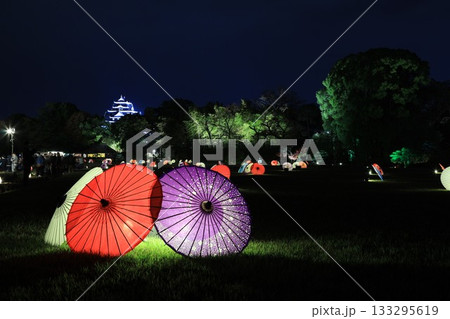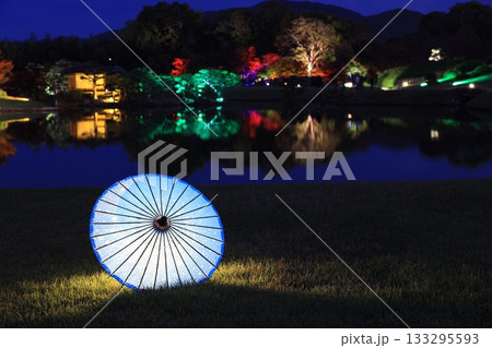 岡山後楽園のライトアップされた和傘