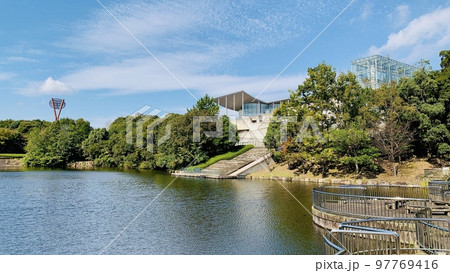 秋晴れの青空に映える恩賜池と岡崎市美術博物館 (岡崎市中央総合公園/愛知県岡崎市)