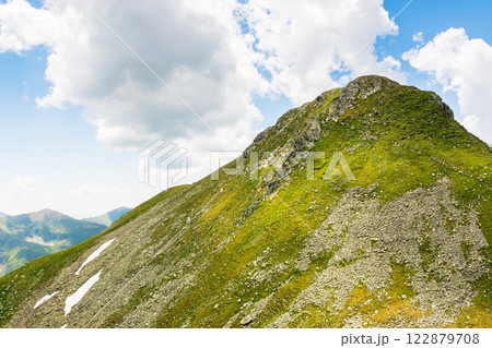 landscape of fagaras mountains in summer. beautiful nature scenery of romania. steep slope, grassy hillside and rocky peak on a sunny day with clouds on the blue sky. scenic travel background