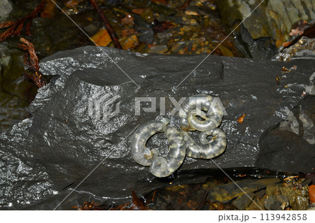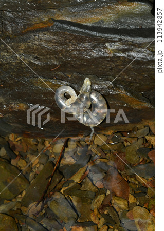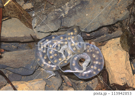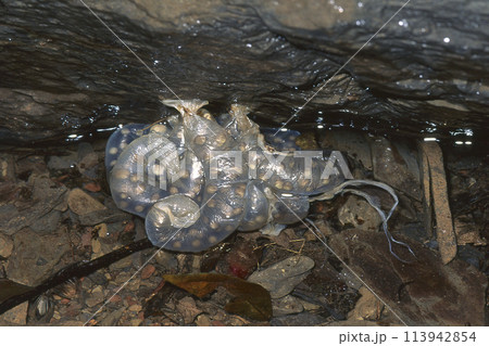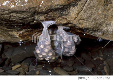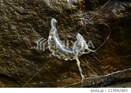 岩に産み付けられたタゴサンショウウオの卵嚢