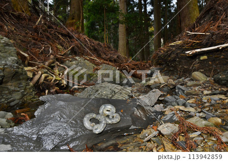 タゴサンショウウオ産卵場所と岩に産み付けられた卵嚢