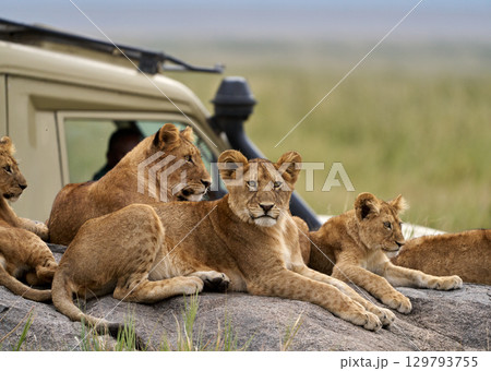 サファリカーの隣でくつろぐライオンの子どもたち(セレンゲティ国立公園)