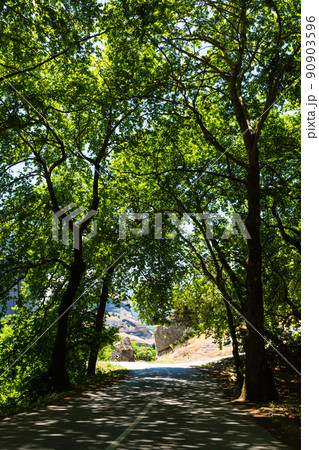 ギリシャ メテオラの木のトンネルと道路