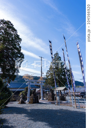 青い空を背景に鳥居と神社境内風景(甑神社)