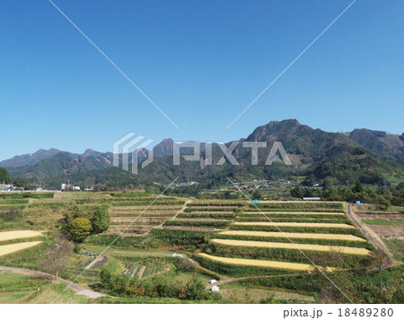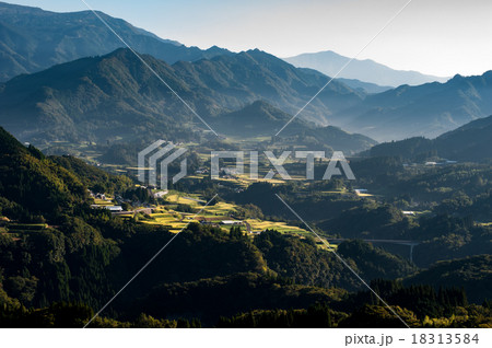 上岩戸大橋から眺める上岩戸の刈り入れ直後の棚田と紅葉 宮崎県西臼杵郡高千穂町上岩戸