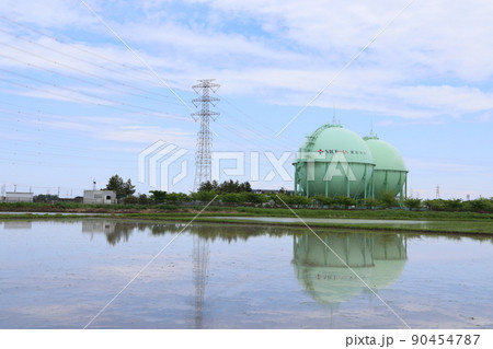 水田と丸いガスタンクの見える風景