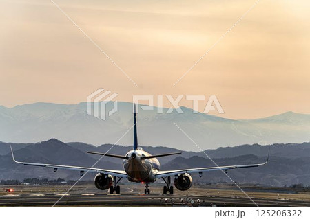 夕暮れの仙台空港 夕日とタキシング中の飛行機 宮城県名取市
