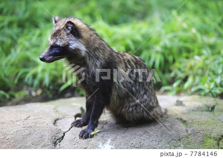 若いタヌキ岩の上にうずくまって何かを見据えている