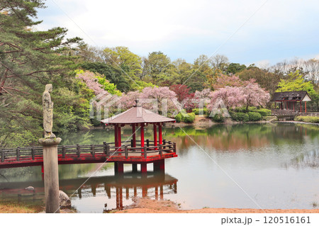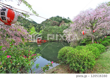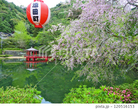 福岡県田川郡の桜の名所添田公園の不動池と枝垂れ桜