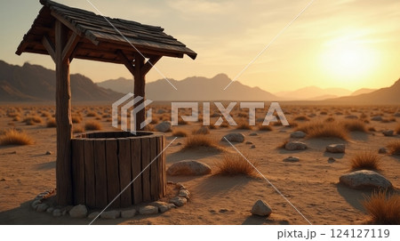 Rustic well stands alone in a vast desert landscape at sunset